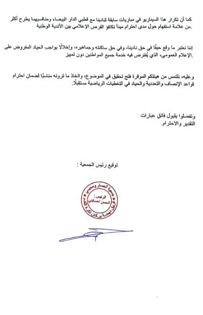 كما أشارت الجمعية إلى أن تكرار ما تعتبره غيابًا للتوازن في مباريات سابقة أمام أندية من الدار البيضاء يثير تساؤلات حول مدى احترام مبدأ تكافؤ الفرص الإعلامي بين مختلف الأندية الوطنية.