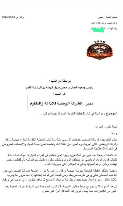 وجّهت جمعية أنصار ومحبي فريق نهضة بركان لكرة القدم مراسلة رسمية إلى الشركة الوطنية للإذاعة والتلفزة، عبّرت فيها عن احتجاجها على ما وصفته باختلالات شابت التغطية التلفزية للمباراة التي جمعت فريقها بـالوداد الرياضي، والتي خلّفت استياءً في صفوف عدد من جماهير النادي.